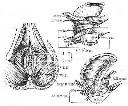 肛管粘膜及皮下的靜脈吻合成叢,可因血流不暢而淤積,以致曲張成痔。位于齒狀線以上者為內痔,位于齒狀線以下者為外痔,基跨越齒狀線上、下者為混合痔。    2、肛門 肛門anus為肛管末端的開口,相當于尾骨尖下方4cm處,通常呈矢狀位縱裂。由于肛門括約肌的緊縮,肛周的皮膚形成輻射狀的皺褶,內含汗腺和皮脂腺。    3、肛門括約肌 位于肛管周圍,包括肛門內括約肌與肛門外括約肌(圖1)。                                      圖1 肛門括約肌及肛直腸環