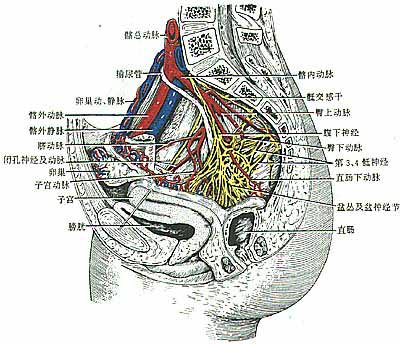 盆部的神經(jīng)一部分來自腰、骶神經(jīng),另一部分來自內(nèi)臟神經(jīng)。腰叢的閉孔神經(jīng)沿盆側(cè)壁經(jīng)閉膜管至股部。腰骶干及出骶前孔的骶神經(jīng)前支組成粗大的骶叢sacral plexus,該叢位于盆側(cè)壁后份的梨狀肌前面,其分支經(jīng)梨狀肌、下孔出盆,分布于臀部、會陰及下肢。